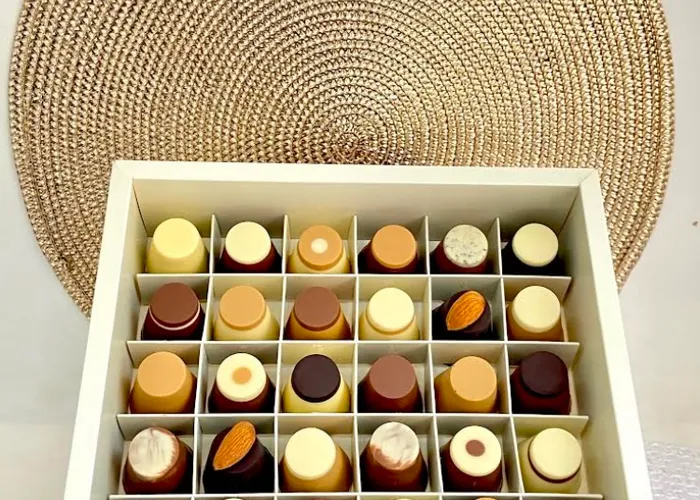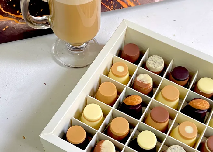 - Volcán gold belga con cacao de orĂgen NORAFRICANO 32% cacao , relleno de ganache de chocolate gold.